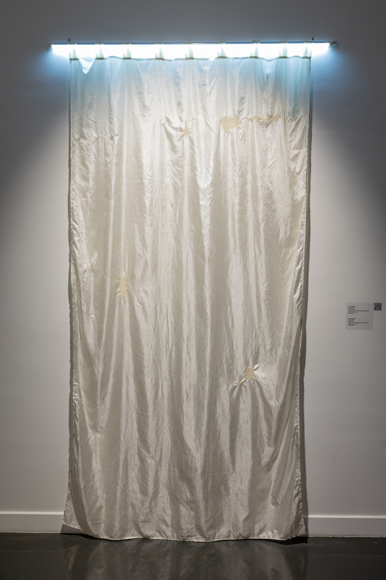 Parlaq LED borusu köhnə atlaz pərdənin sakit enişini dayandırır. Onun soyuq, xətti işığı parçanın üzərinə yayılaraq, həm atlazın yumşaq parlaqlığını, həm də əl ilə tikilərək bərpa olunmuş yerlərinin kobudluğunu üzə çıxarır.
