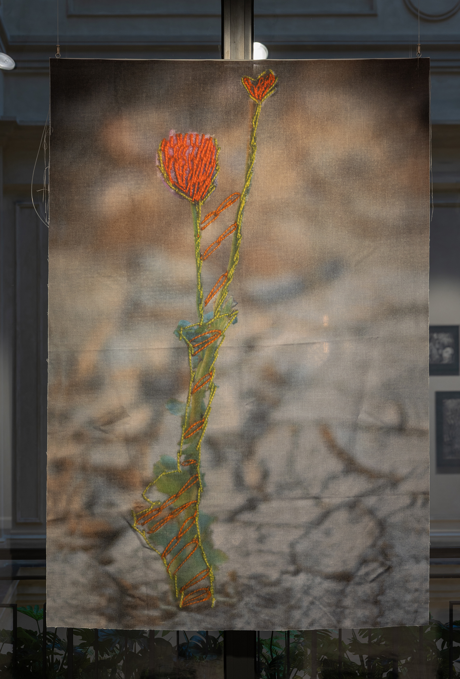 Qərba vadisində on il davam edən quraqlığın son ilində quru torpaqdan cücərən çiçəyin parça üzərində naxışlanmış fotoşəkili. Tikmə işi Əl-Tarfa kəndindən Ümmü Ənəs tərəfindən hazırlanıb. Müqəddəs Yekaterina, Cənubi Sinay, Misir, 2020.