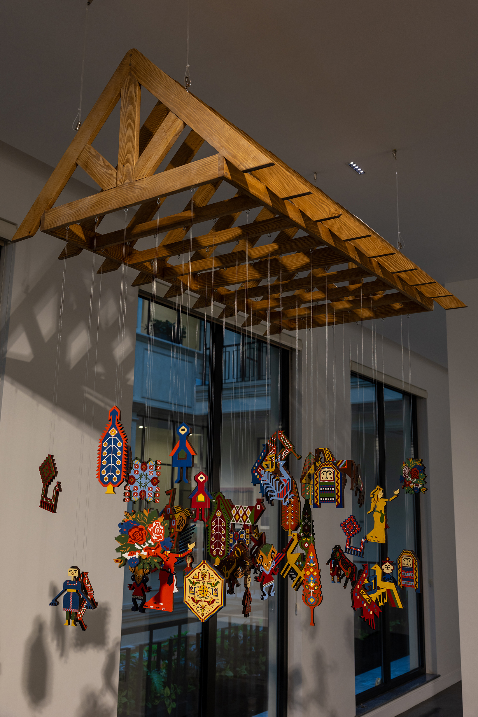 Eyni damın altında instalyasiyası dünyanı ortaq bir ev kimi dərk etmə ideyasına əsaslanır. Əsər planetimizi birlikdə paylaşan bütün canlılar – insanlar, heyvanlar, quşlar və təbiət – arasında birgəyaşayış və bərabərlik anlayışlarını araşdırır. İş taxtadan hazırlanmış dam formasında qurulub və bu forma ümumi sığınacağı simvollaşdırır. Damın altında izləyicilərin başı üzərində müxtəlif canlıları təmsil edən taxta fiqurlar asılıb. Bu fiqurlar illustrativ xalça naxışlarından ilhamlanan vizual dildə işlənərək Azərbaycan və dünya ənənəvi ornamental irsinə istinad edirlər. Bütün canlıları iyerarxiyasız şəkildə eyni dam altında bir araya gətirən instalyasiya izləyicini ətraf-mühitlə münasibətini yenidən qiymətləndirməyə, ortaq məsuliyyət, tarazlıq və hər bir canlının bu evdə mövcud olmaq, nəfəs almaq və böyümək haqqı üzərində düşünməyə dəvət edir.