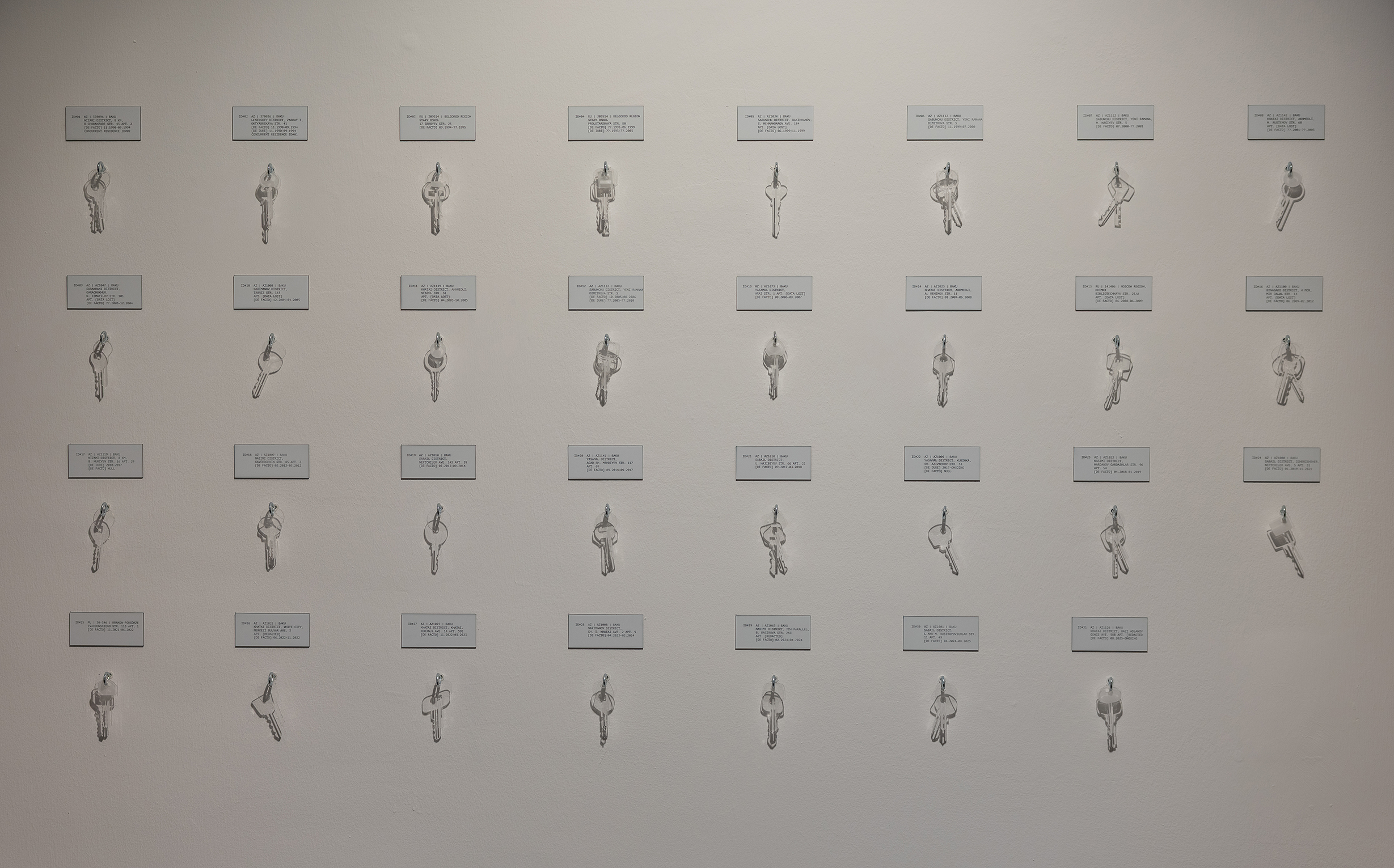İnstalyasiya yerdəyişmələrin sənədli sübutu olan 31 real ünvanı təqdim edir. Hər bir qeyd arxiv lövhəsi ilə müşayiət olunur: bunlar sadəcə məlumatlar deyil, həyatı bir sistem formatında qeyd etmək cəhdidir; burada hətta yaddaşın itmiş parçaları belə texniki nasazlıq kimi qeyd olunub: [DATA LOST].