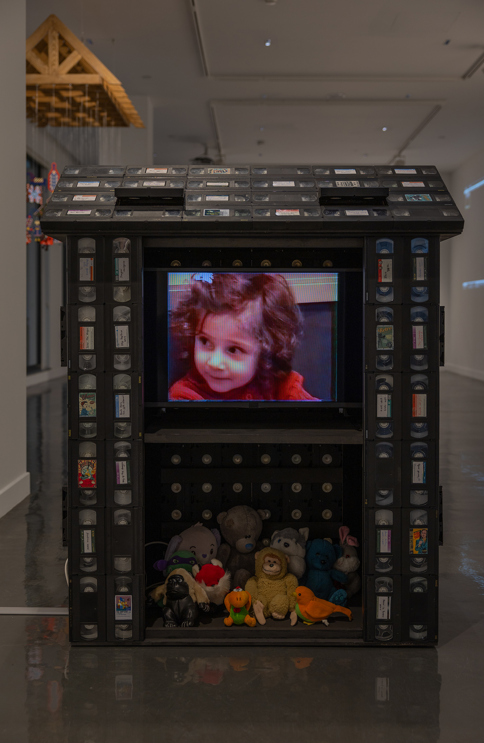 The installation takes the form of a small, two-story house constructed from old videotapes. The tapes function as the walls and structural elements of the house, with intentional gaps left in certain areas to allow light to pass through. These openings symbolize the seepage of time and the fragmented yet luminous nature of memory. A monitor within the house’s window displays video footage from Leyla’s childhood.